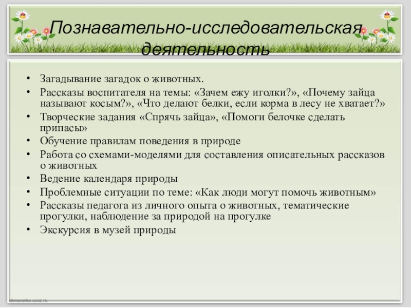 Рассказы педагога из личного опыта о животных, тематические прогулки, наблюдение за природой на прогулке