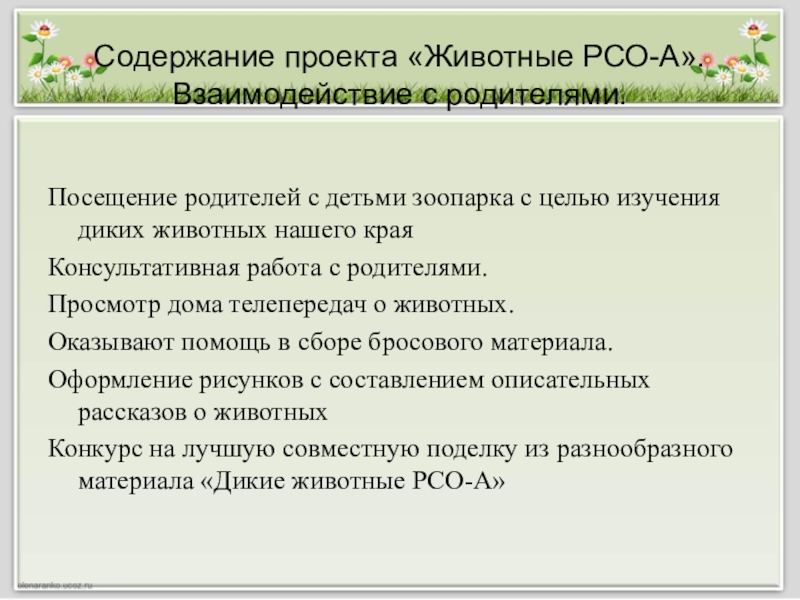 Слайд 35Содержание проекта «Животные РСО-А».Взаимодействие с родителями.