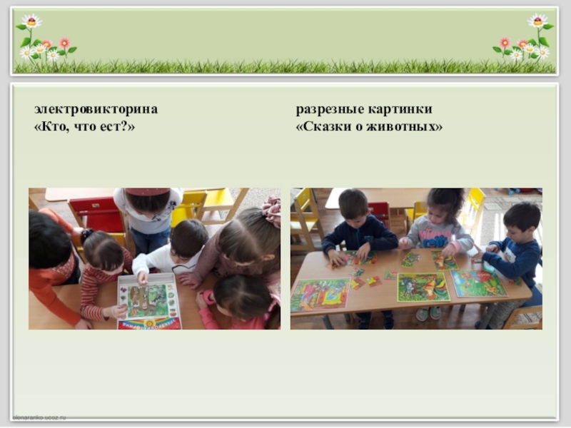 игры: «Кто где живёт»,«Чьи детки?», «Где чья мама?», «Четвертый лишний», «Сказки о животных», электровикторина «Кто, что ест?», разрезные картинки «Сказки о животных»