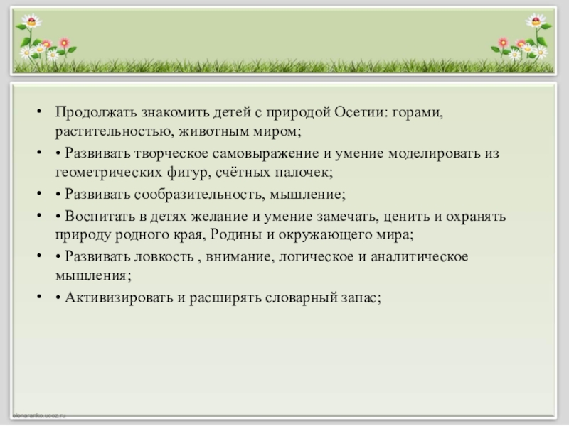 Слайд 3Продолжать знакомить детей с природой Осетии: горами, растительностью, животным миром;