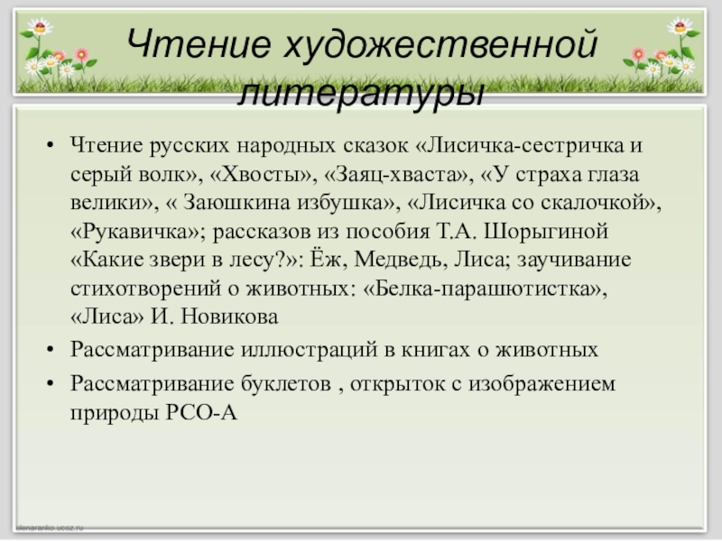 «Заяц-хваста», «У страха глаза велики», « Заюшкина избушка», «Лисичка со скалочкой», «Рукавичка»; рассказов из пособия Т.А. Шорыгиной «Какие звери в лесу?»: Ёж, Медведь, Лиса; заучивание стихотворений о животных: «Белка-парашютистка», «Лиса» И. Новикова