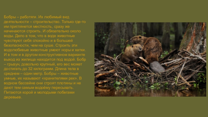 Слайд 15Бобры – работяги. Их любимый вид деятельности – строительство. Только где-то