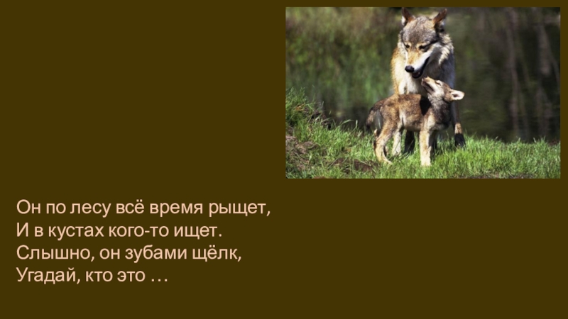 Слайд 7Волки – стайные животные. Члены стаи – это родственники и прибившиеся