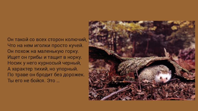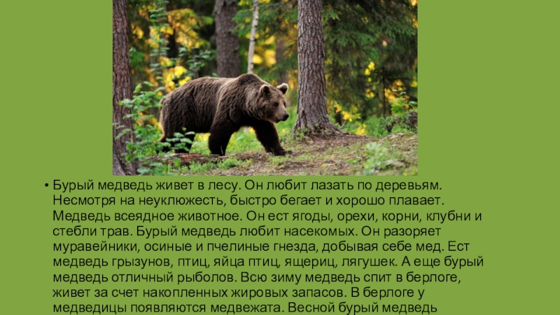 Слайд 3Бурый медведь живет в лесу. Он любит лазать по деревьям. Несмотря