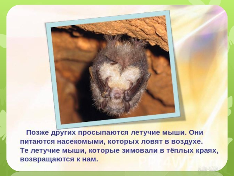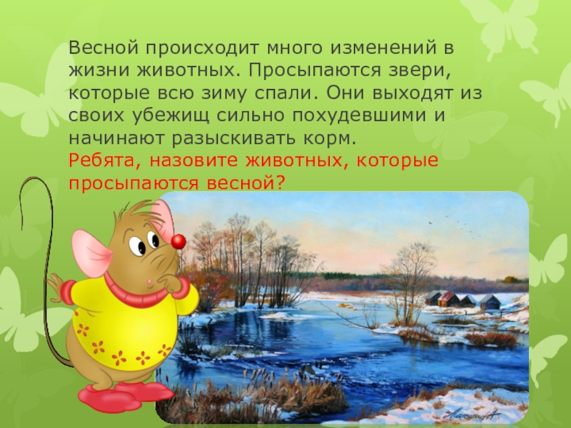 зиму спали. Они выходят из своих убежищ сильно похудевшими и начинают разыскивать корм. Ребята, назовите животных, которые просыпаются весной?
