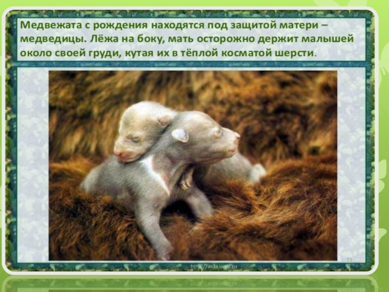 Маленькие медвежата появляются еще зимой в трескучий мороз. Они маленькие, с рукавичку, и мать их еще кормит