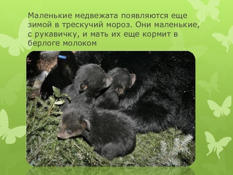 Слайд 13Маленькие медвежата появляются еще зимой в трескучий мороз. Они маленькие, с
