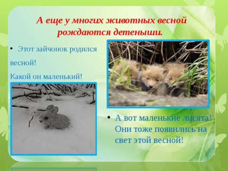 исследовать всю территорию вокруг себя на предмет пищи и на предмет опасности. Ребята, давайте посмотрим, какие животные, как ведут себя весной?