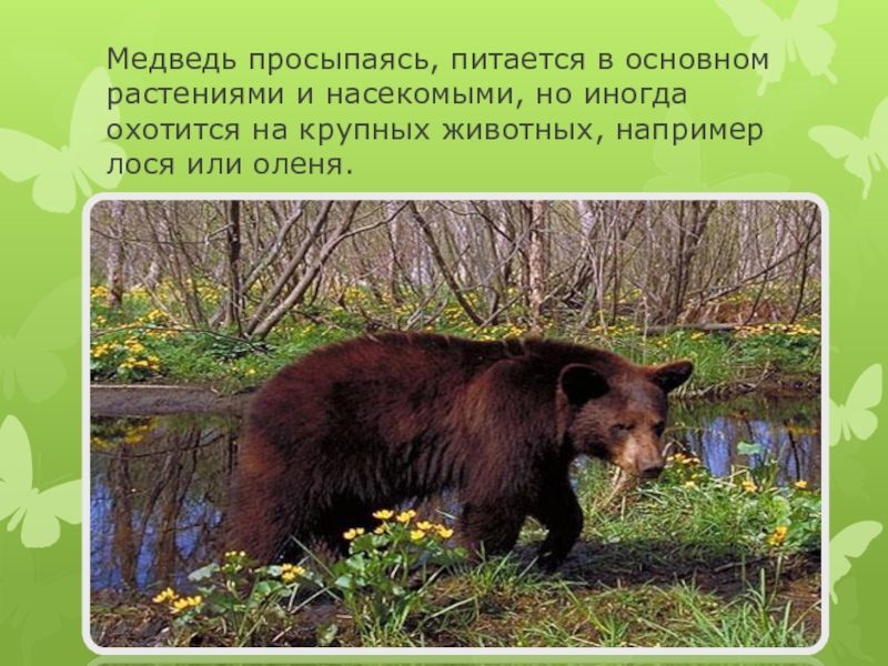 Слайд 6Медведь просыпаясь, питается в основном растениями и насекомыми, но иногда охотится