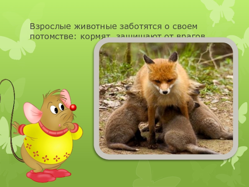 Слайд 12Взрослые животные заботятся о своем потомстве: кормят, защищают от врагов.