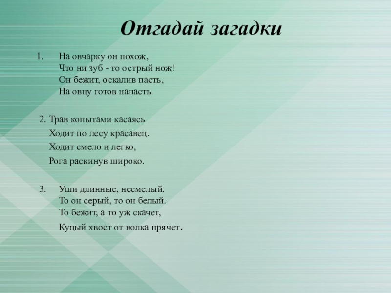 Отгадай загадкиНа овчарку он похож,  Что ни зуб - то острый нож! Он бежит, оскалив пасть,