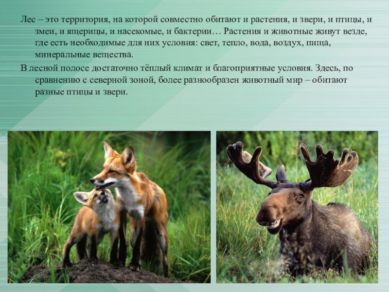 Лес – это территория, на которой совместно обитают и растения, и звери, и птицы, и змеи, и ящерицы, и насекомые, и бактерии… Растения и животные живут везде, где есть необходимые для них условия: свет, тепло, вода,