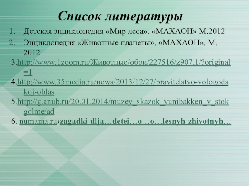 Список литературыДетская энциклопедия «Мир леса». «МАХАОН» М.2012Энциклопедия «Животные планеты». «МАХАОН». М. 20123.http://www.1zoom.ru/Животные/обои/227516/z907.1/?original=1 4.http://www.35media.ru/news/2013/12/27/pravitelstvo-vologodskoj-oblas 5.http://g.anub.ru/20.01.2014/muzey_skazok_yunibakken_v_stokgolme/ad 6. numama.ru›zagadki-dlja…detei…o…o…lesnyh-zhivotnyh…
