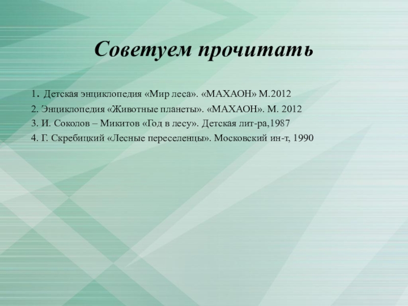 Советуем прочитать1. Детская энциклопедия «Мир леса». «МАХАОН» М.20122. Энциклопедия «Животные планеты». «МАХАОН». М. 20123. И. Соколов –
