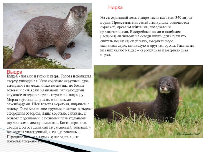 На сегодняшний день в мире насчитывается 340 видов норки. Представители семейства куньих отличаются окраской, ареалом обитания, повадками и предпочтениями. Востребованными и наиболее распространенными на сегодняшний день принято считать норку европейскую, американскую, скандинавскую, канадскую и другие породы. Главными виз них являются две – европейская и американская норка.
