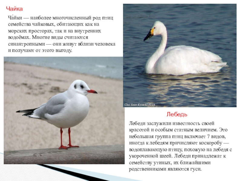 Лебеди заслужили известность своей красотой и особым статным величием. Это небольшая группа птиц включает 7 видов, иногда к лебедям причисляют коскоробу — водоплавающую птицу, похожую на лебедя с укороченной шеей. Лебеди принадлежат к семейству утиных, их ближайшими родственниками являются гуси.