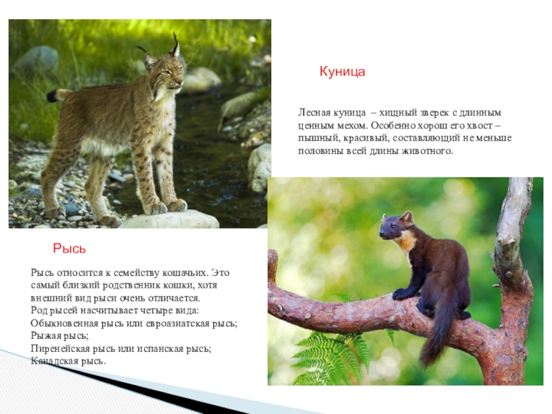 Лесная куница – хищный зверек с длинным ценным мехом. Особенно хорош его хвост – пышный, красивый, составляющий не меньше половины всей длины животного.