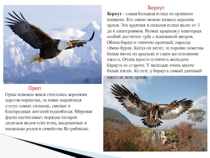 Беркут - самая большая птица из орлиного племени. Его смело можно назвать королем орлов. Это крупная и сильная птица весит от 3 до 6 килограммов. Размах крыльев у некоторых особей достигает трёх с половиной метров. Облик беркута типично орлиный, окраска тёмно-бурая. Когда он летит, то хорошо заметны белые пятна на крыльях и такое же основание хвоста. Очень просто отличить молодого беркута от старого. У молодых очень много белых пятен. Кстати, у беркута самый длинный хвост из всех орлов.