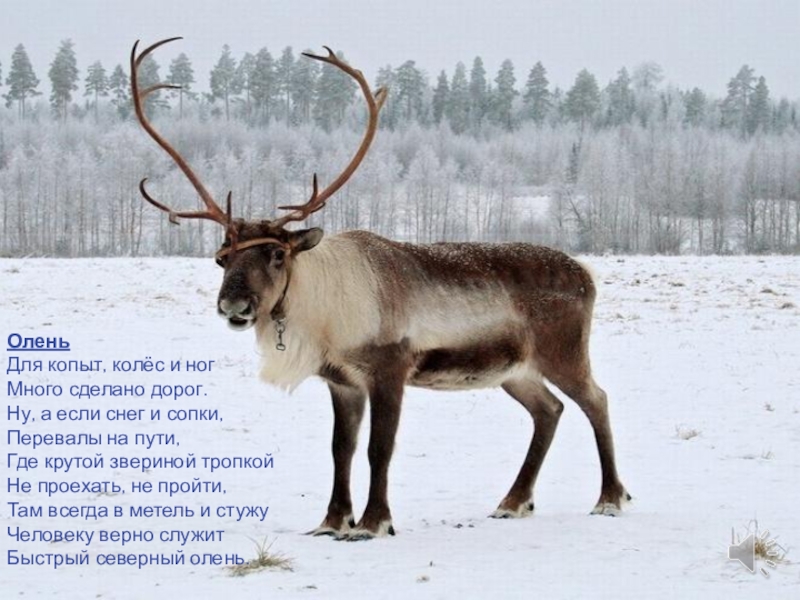 сопки, Перевалы на пути, Где крутой звериной тропкой Не проехать, не пройти, Там всегда в метель и стужу Человеку верно служит Быстрый северный олень.