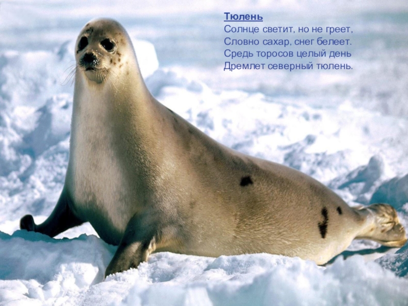 Тюлень Солнце светит, но не греет,Словно сахар, снег белеет.Средь торосов целый деньДремлет северный тюлень.