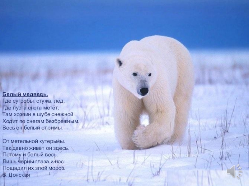 Слайд 5Белый медведь. Где сугробы, стужа, лёд, Где пурга снега метёт, Там хозяин в шубе
