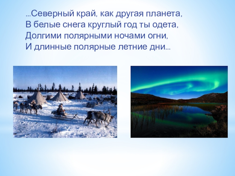 Слайд 13…Северный край, как другая планета, В белые снега круглый год ты одета, Долгими