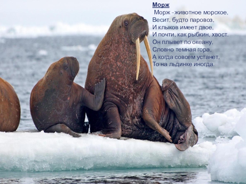 Морж Морж -животное морское,Весит, будто паровоз,И клыков имеет двое,И почти, как рыбкин, хвост.Он плывет по океану,Словно темная