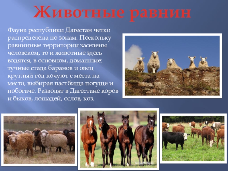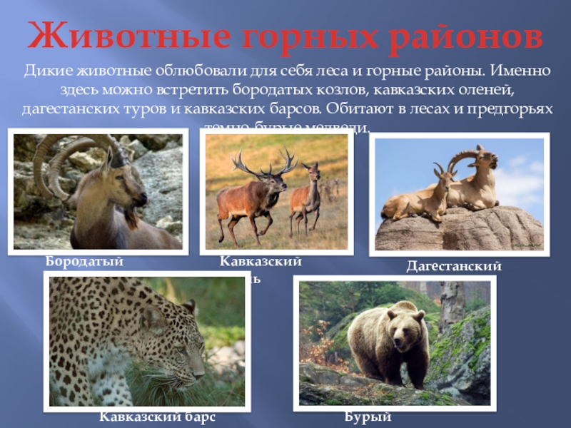 Республика Дагестан уверенно входит в число лидеров по количеству и разнообразию представленных в регионе животных. Из млекопитающих биологи насчитали здесь 89 видов, пресмыкающихся — 49 видов, а птиц — свыше 300 видов.