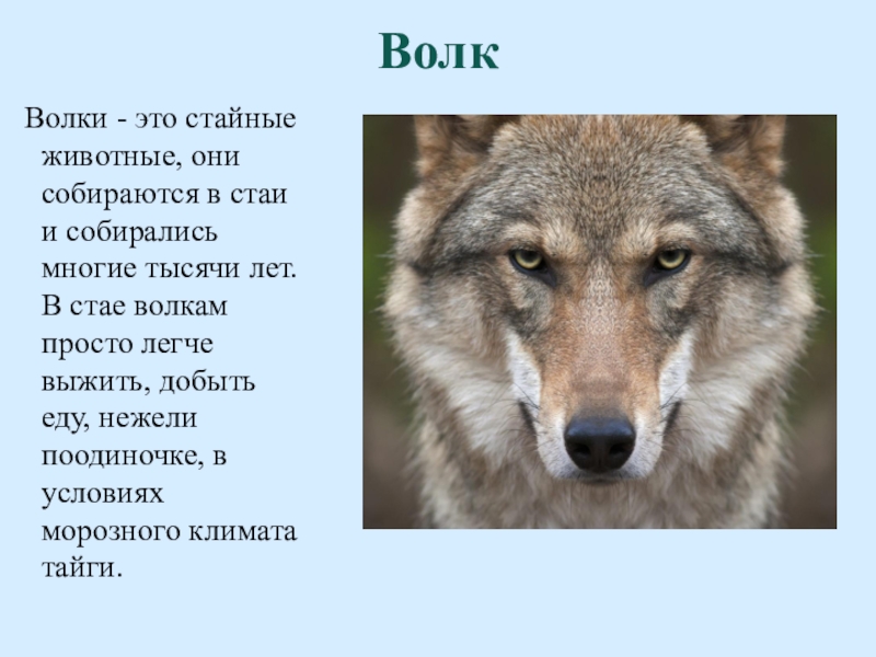 Волк  Волки - это стайные животные, они собираются в стаи и собирались многие тысячи лет. В