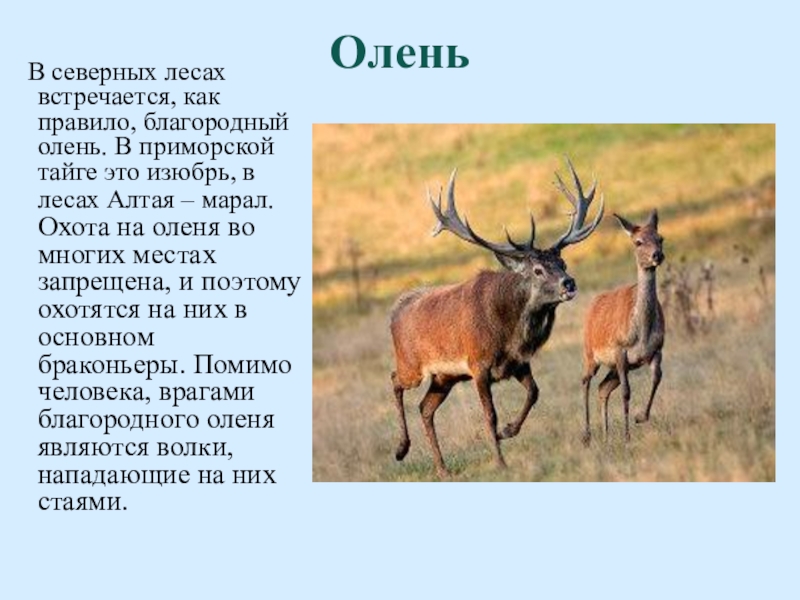 приморской тайге это изюбрь, в лесах Алтая – марал. Охота на оленя во многих местах запрещена, и поэтому охотятся на них в основном браконьеры. Помимо человека, врагами благородного оленя являются волки, нападающие на них стаями.