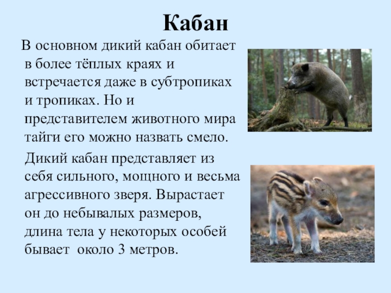 Кабан   В основном дикий кабан обитает в более тёплых краях и встречается даже в субтропиках и тропиках.