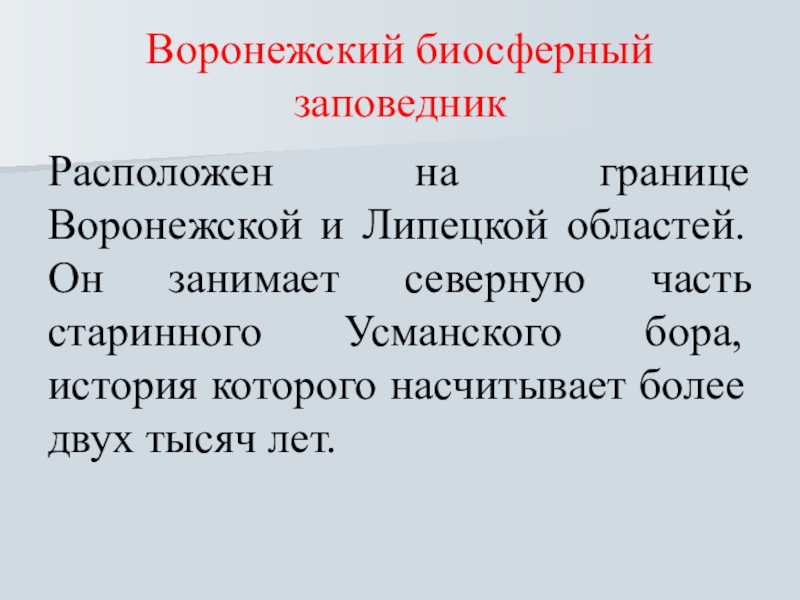 Воронежский биосферный заповедникРасположен на границе Воронежской и Липецкой областей. Он занимает северную часть старинного Усманского бора, история