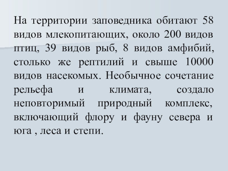 Слайд 3На территории заповедника обитают 58 видов млекопитающих, около 200 видов птиц,