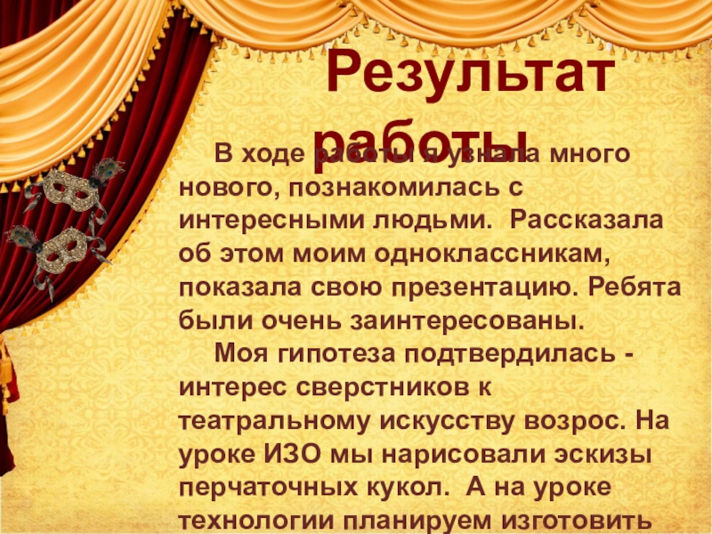 Моя гипотеза подтвердилась - интерес сверстников к театральному искусству возрос. На уроке ИЗО мы нарисовали эскизы перчаточных кукол. А на уроке технологии планируем изготовить театральные куклы.