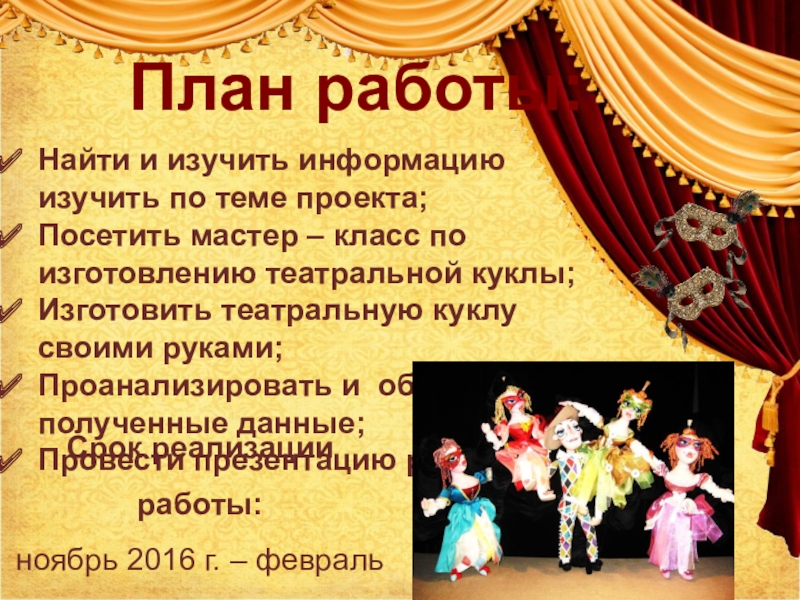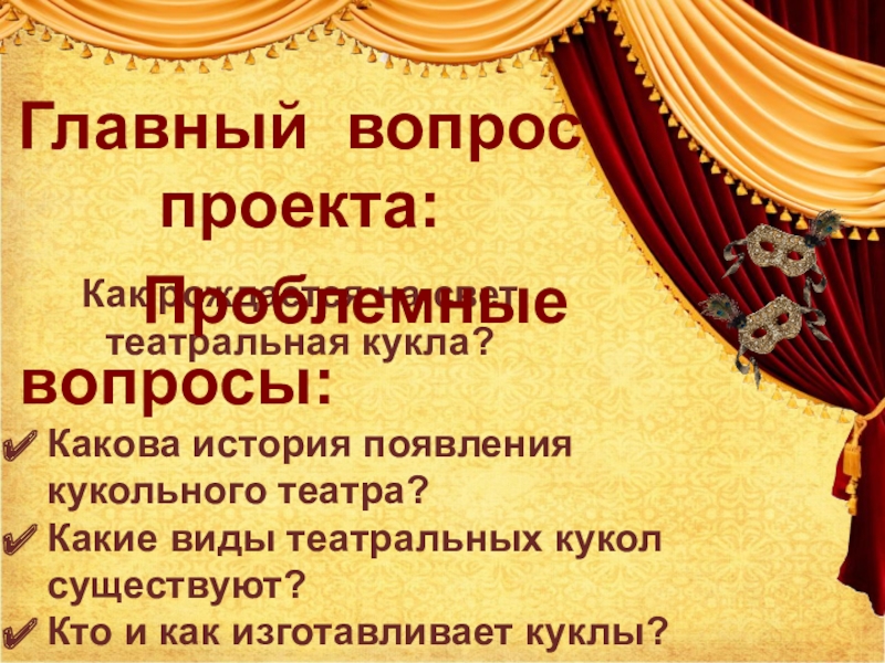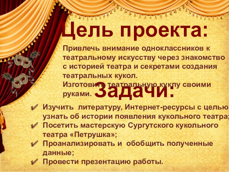 Привлечь внимание одноклассников к театральному искусству через знакомство с историей театра и секретами создания театральных кукол.