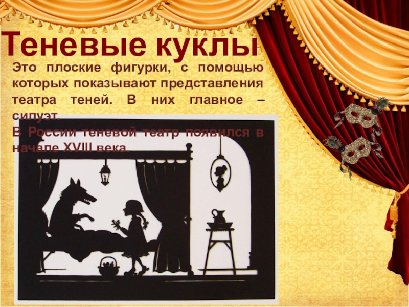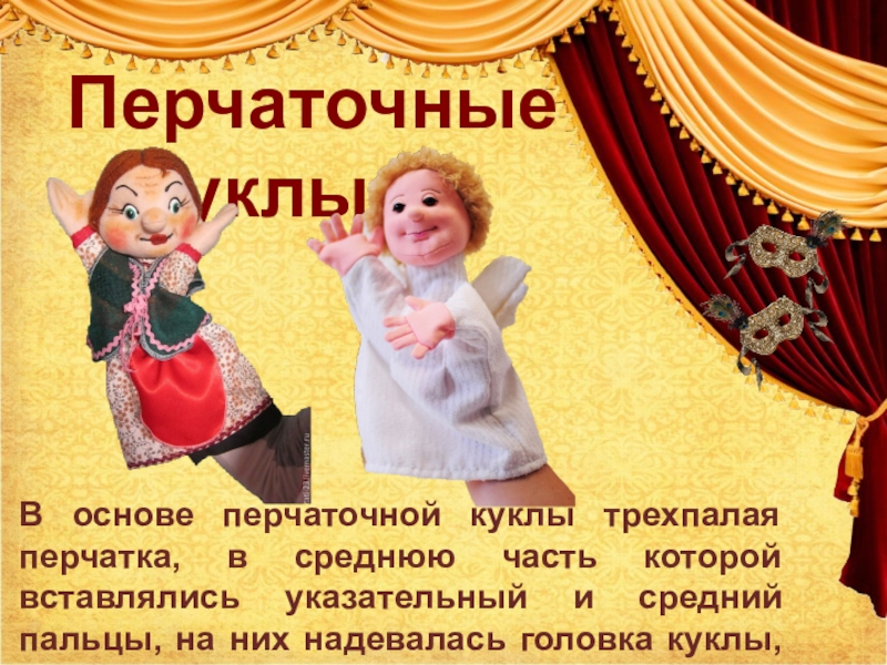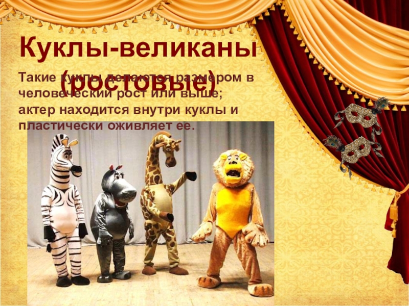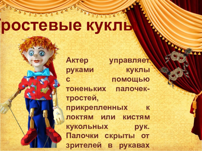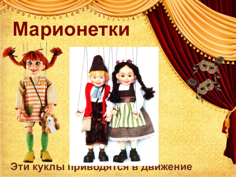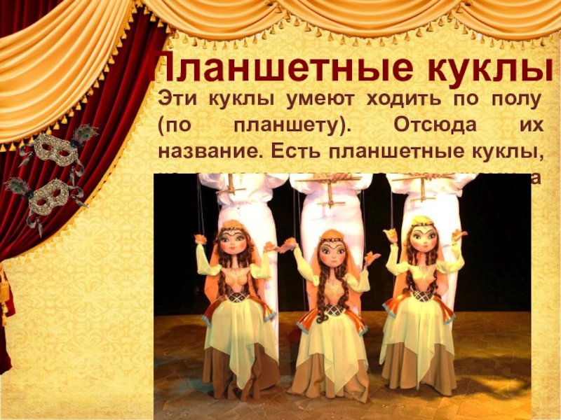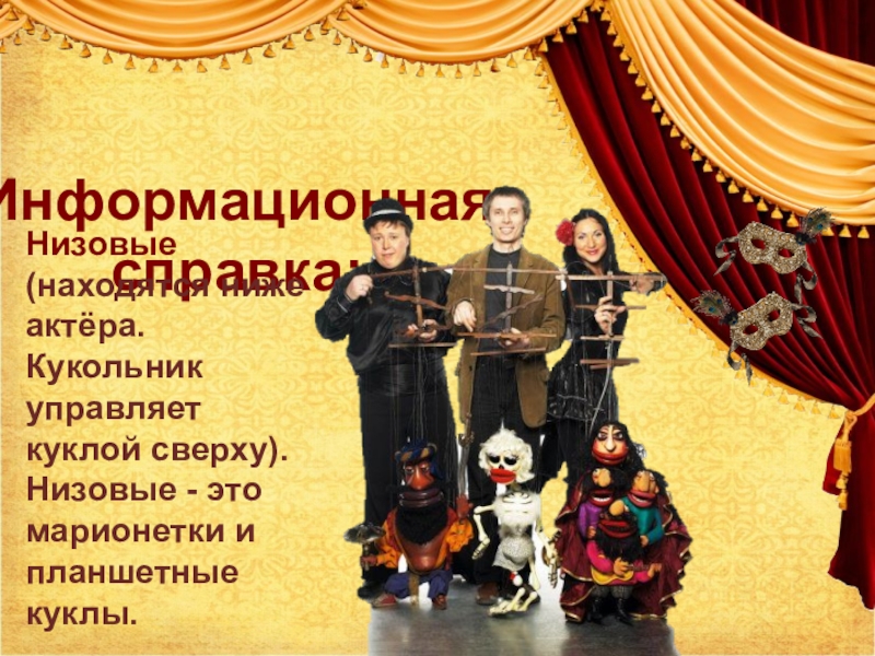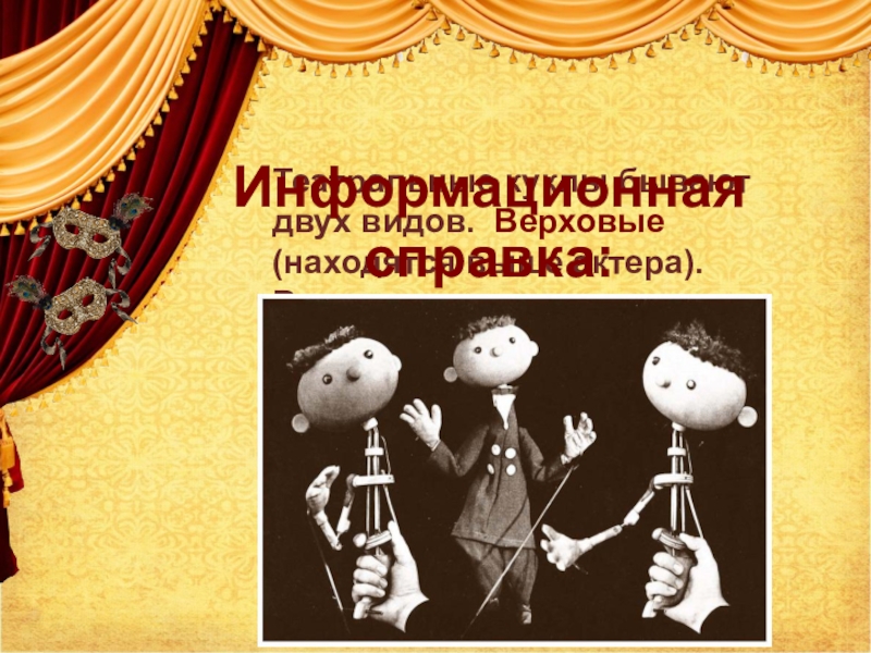 Слайд 18Театральные куклы бывают двух видов. Верховые (находятся выше актера). Верховые -