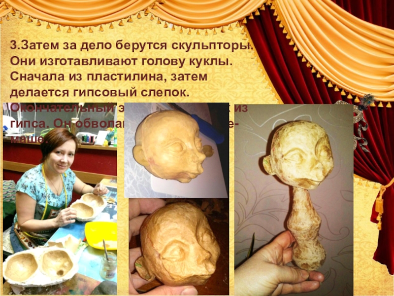 Слайд 293.Затем за дело берутся скульпторы. Они изготавливают голову куклы. Сначала из