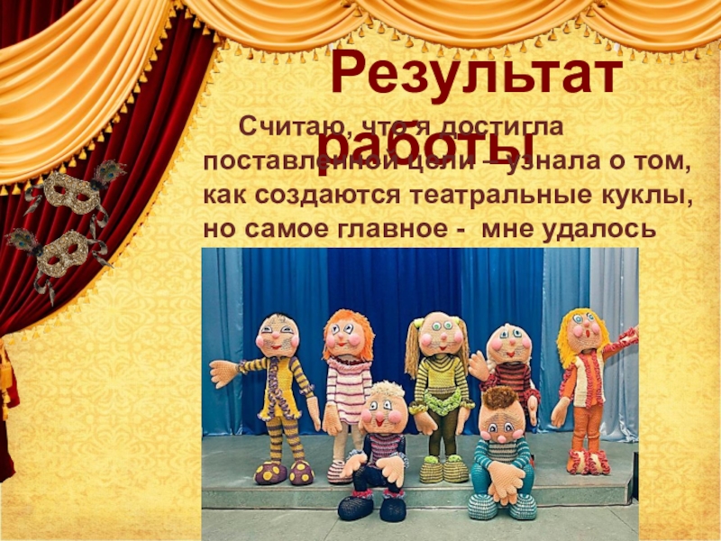 узнала о том, как создаются театральные куклы, но самое главное - мне удалось заинтересовать данной темой своих одноклассников.