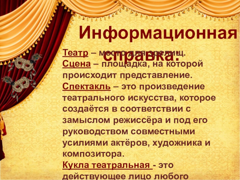 Спектакль – это произведение театрального искусства, которое создаётся в соответствии с замыслом режиссёра и под его руководством совместными усилиями актёров, художника и композитора.