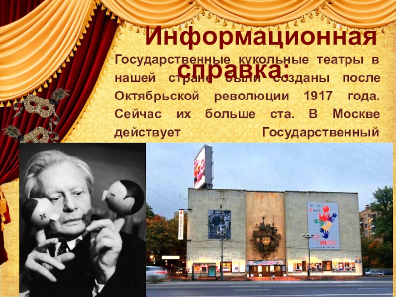 1917 года. Сейчас их больше ста. В Москве действует Государственный центральный театр кукол. Его создатель и руководитель — народный артист СССР Сергей Владимирович Образцов.