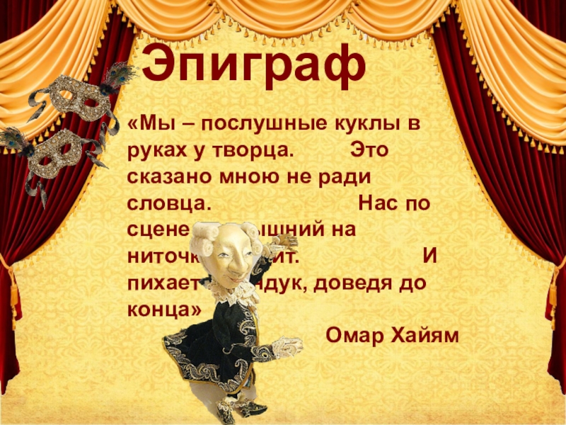«Мы – послушные куклы в руках у творца. Это сказано мною не ради словца. Нас по сцене всевышний на ниточках водит. И пихает в сундук, доведя до конца»