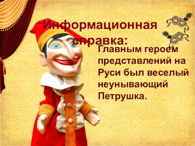 Слайд 14Главным героем представлений на Руси был веселый неунывающий Петрушка.