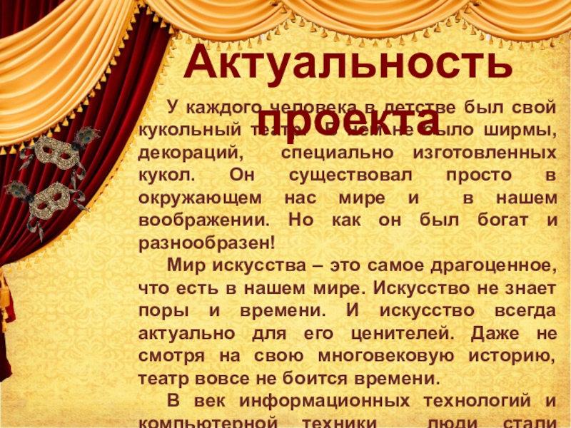 Мир искусства – это самое драгоценное, что есть в нашем мире. Искусство не знает поры и времени. И искусство всегда актуально для его ценителей. Даже не смотря на свою многовековую историю, театр вовсе не боится времени.