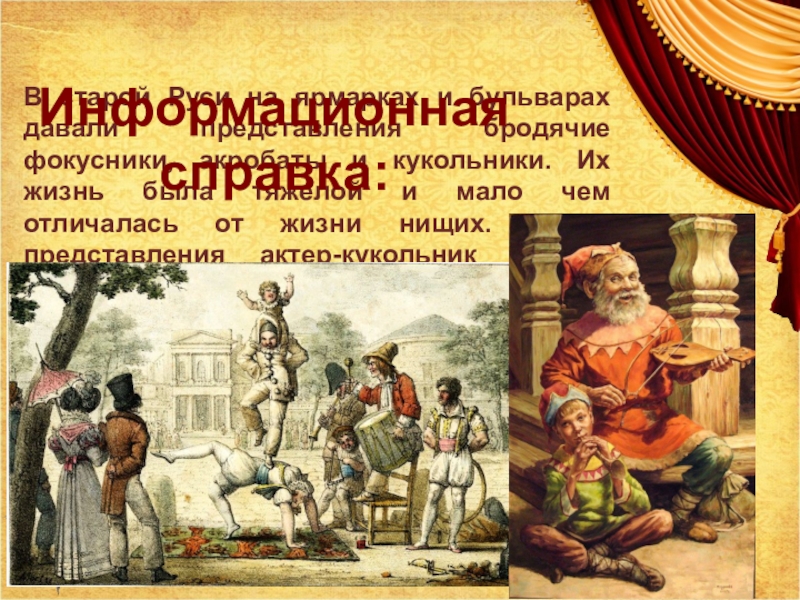 Слайд 13В старой Руси на ярмарках и бульварах давали представления бродячие фокусники,