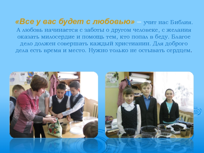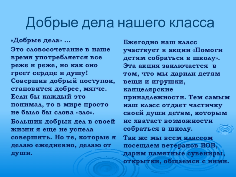 Ежегодно наш класс участвует в акции «Помоги детям собраться в школу». Эта акция заключается в том, что мы дарили детям вещи и игрушки, канцелярские принадлежности. Тем самым наш класс отдает частичку своей души детям, которым не хватает возможности собраться в школу.