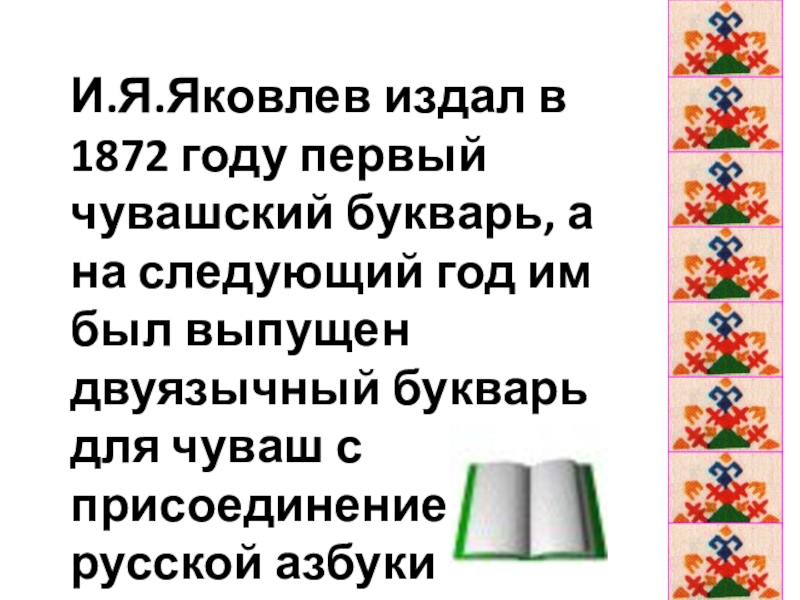 1. Букварь для чуваш. Казань, 1872 (издавался до 1919 г.).