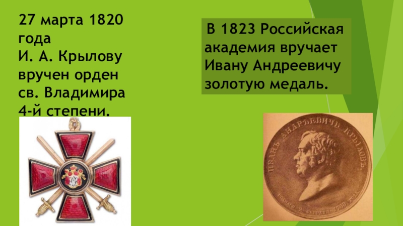В 1823 Российская академия вручает Ивану Андреевичу золотую медаль.