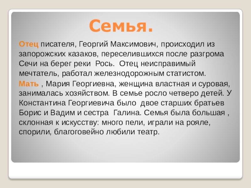 Мать , Мария Георгиевна, женщина властная и суровая, занималась хозяйством. В семье росло четверо детей. У Константина Георгиевича было двое старших братьев Борис и Вадим и сестра Галина. Семья была большая , склонная к искусству: много пели, играли на рояле, спорили, благоговейно любили театр.