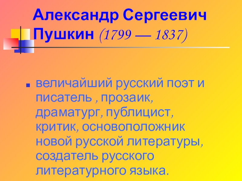 Александр Сергеевич Пушкин (1799 — 1837)величайший русский поэт и писатель , прозаик, драматург, публицист, критик, основоположник новой русской литературы, создатель русского литературного языка.