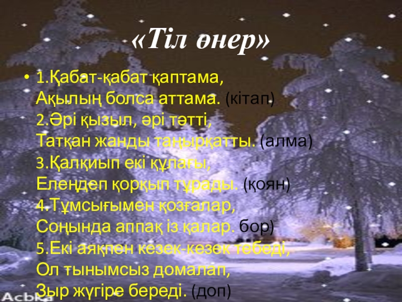 «Тіл өнер» 1.Қабат-қабат қаптама, Ақылың болса аттама. (кітап) 2.Әрі қызыл, әрі тәтті, Татқан жанды таңырқатты. (алма) 3.Қалқиып